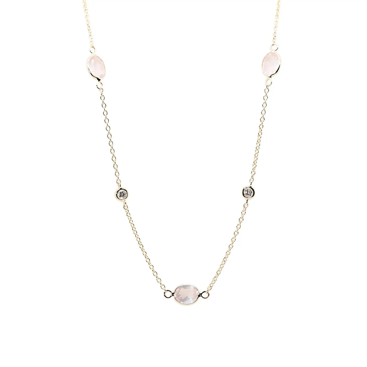 Upea jalokivikaulakoru, joka yhdistää ruusukvartsien lämpimän sävyn säihkyviin timantteihin. Laadukas 14 karaatin keltakulta korostaa jalokivien kauneutta ja tekee tästä korusta ajattoman klassikon.