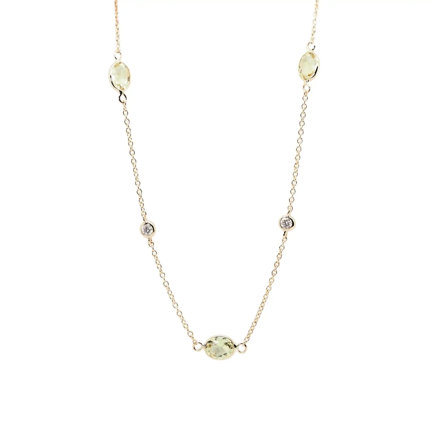 Hienostunut jalokivikaulakoru, joka huokuu tyylikkyyttä. Sitruunakvartsi ja timantit on istutettu kauniisti 14 karaatin keltakultaan, luoden korun joka kestää aikaa.