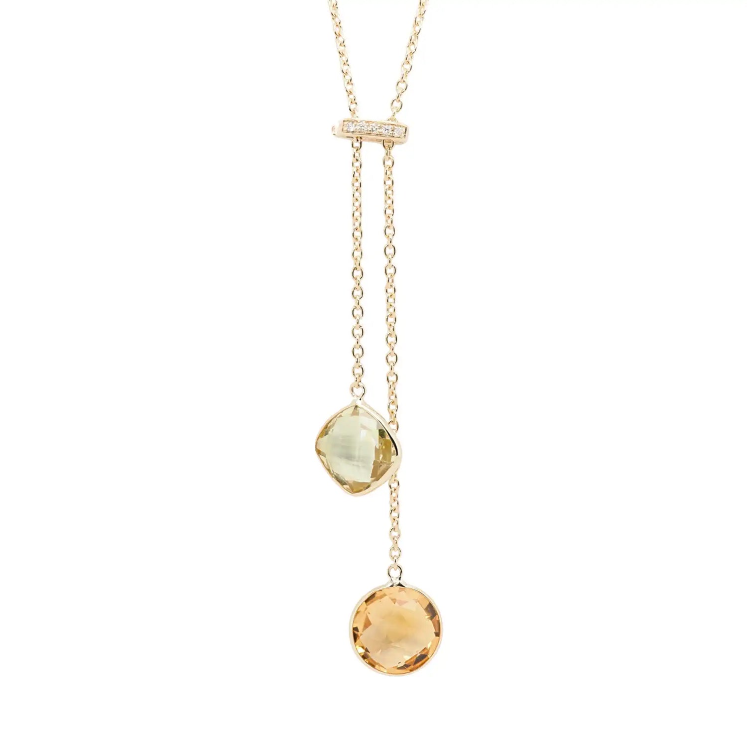 Upea jalokivikaulakoru, joka yhdistää sitruunakvartsin ja sitriinin lämpimän sävyn säihkyviin timantteihin. Laadukas 14 karaatin keltakulta korostaa jalokivien kauneutta ja tekee tästä korusta ajattoman klassikon.