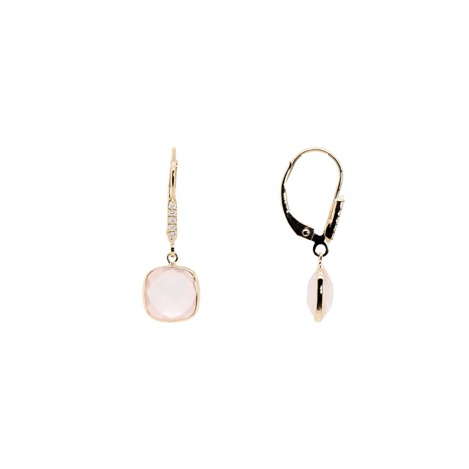 Hienostuneet korvakorut, joissa ruusukvartsit ja timantit tanssivat valossa. Nämä 14 karaatin keltakultakorvakorut ovat täydellinen lisä korumaljakkoon.