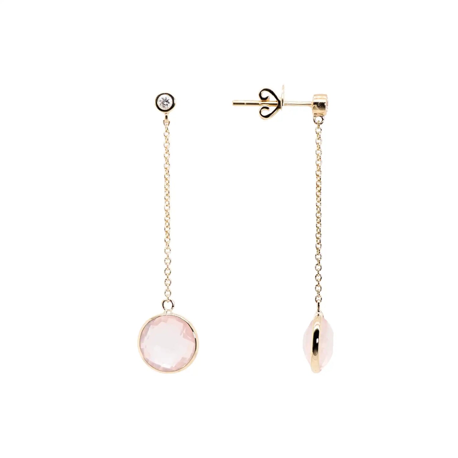 Näyttävät ja elegantit korvakorut, joissa ruusukvartsit loistavat timanttien rinnalla. 14 karaatin keltakultaiset korvakorut ovat täydellinen valinta juhlaan tai arkeen.