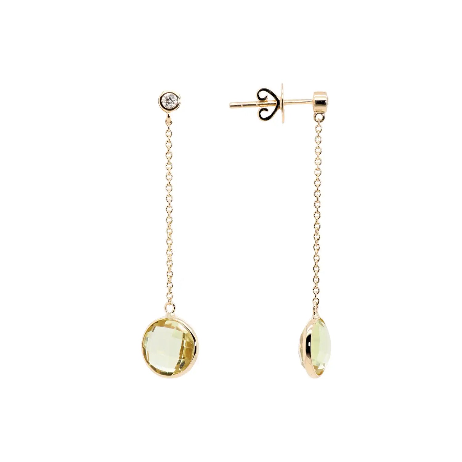 Tyylikkäät jalokivikorvakorut, jotka saavat sinut loistamaan. Sitruunakvartsi ja timantit on istutettu 14 karaatin keltakultaan, luoden ajattoman kauniin korun.